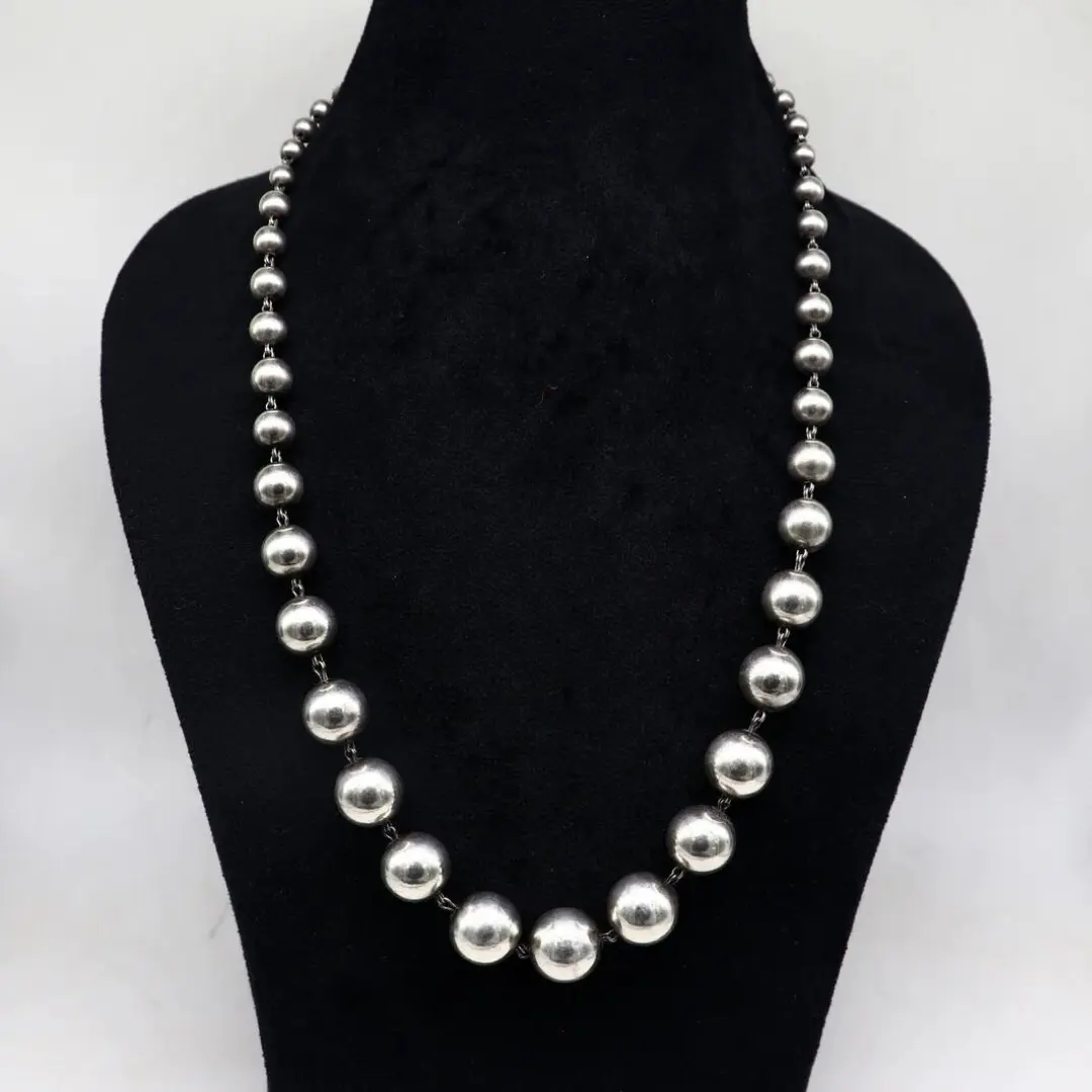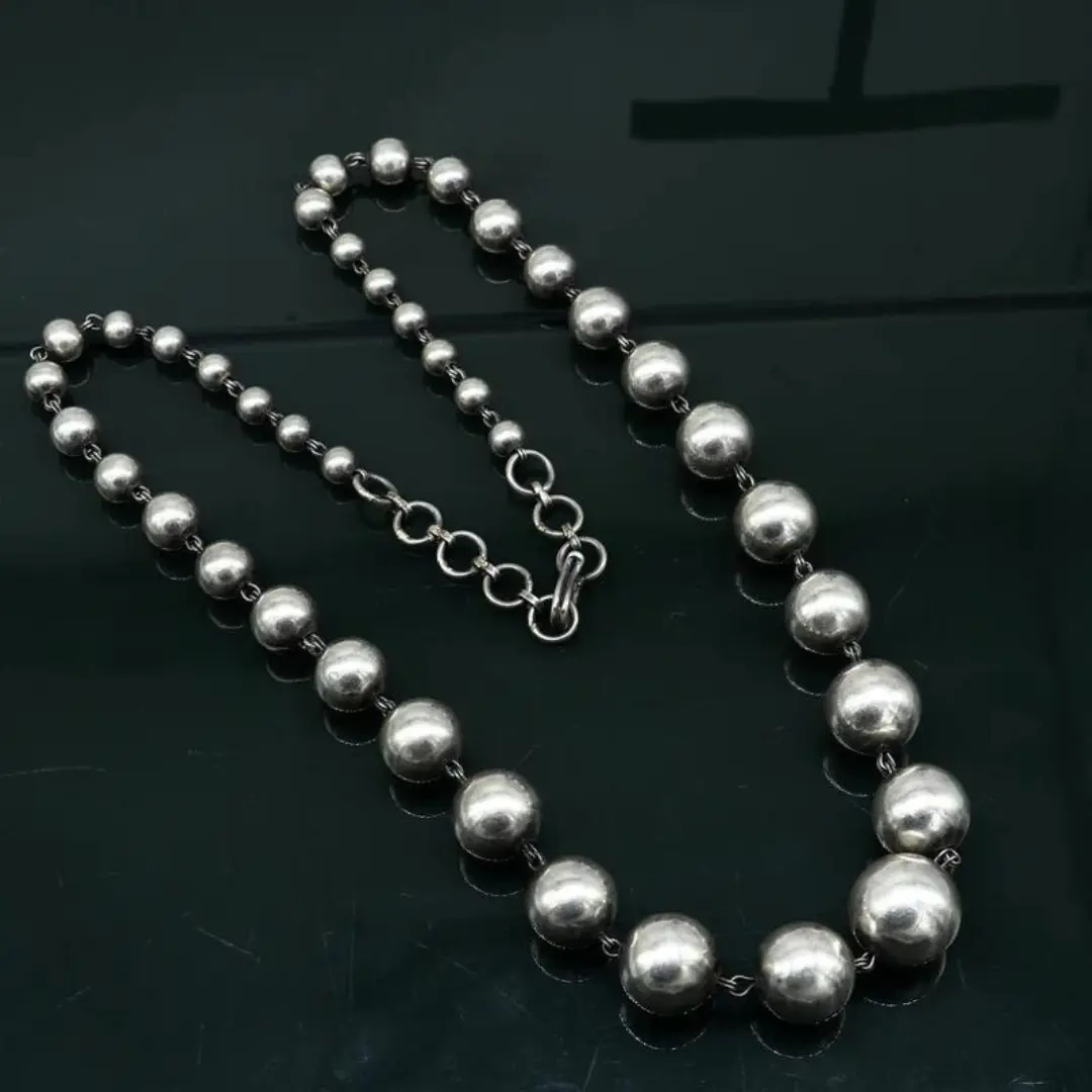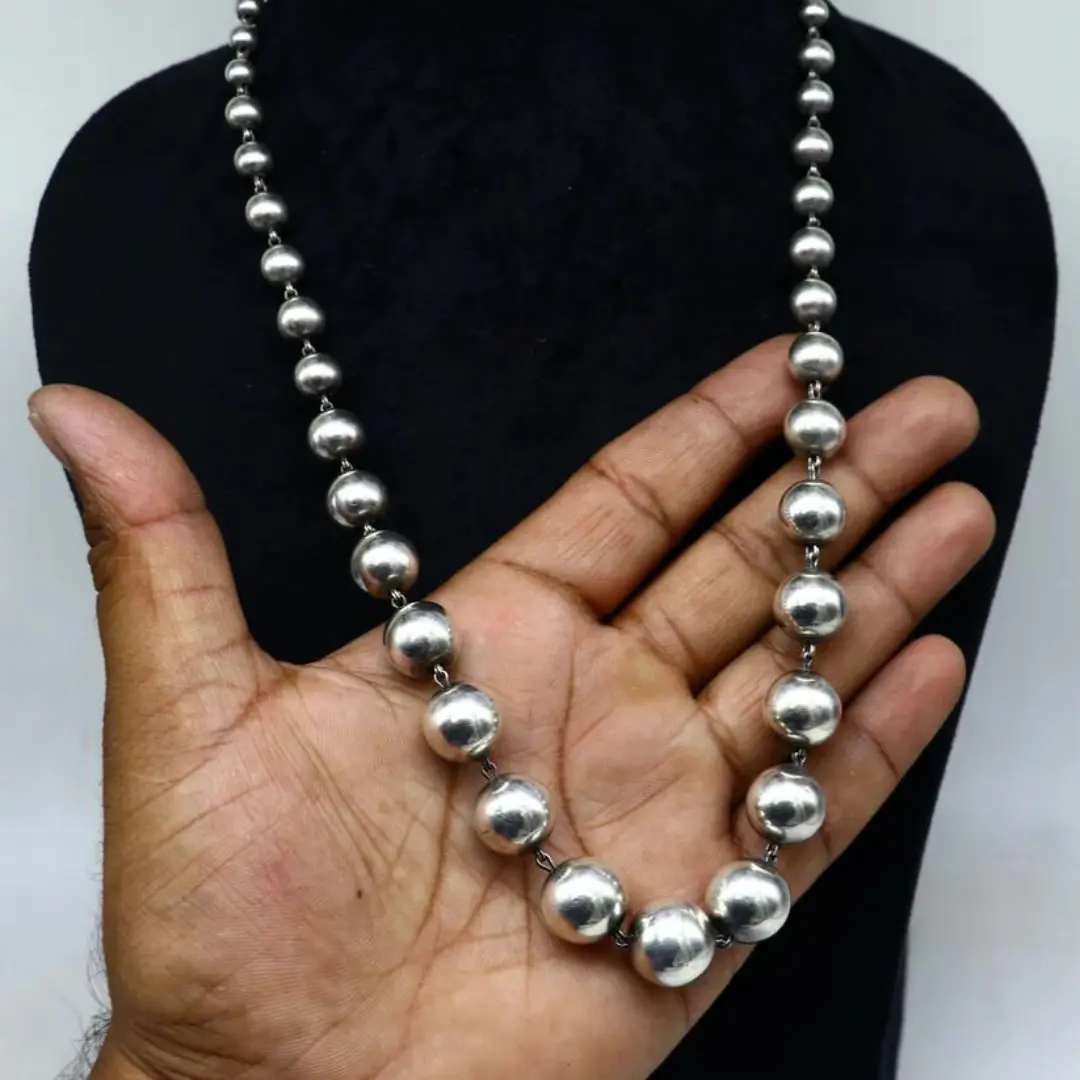 Elevate your style with our exquisite 925 sterling silver customized stylish beaded necklace (NEC360). This fabulous designer piece, perfect for brides, makes an excellent choice for gifting on weddings and anniversaries. The tribal jewelry design adds a unique touch, showcasing craftsmanship from India. The necklace is 21.5 inches in length, featuring beads ranging from 15 mm to 6 mm in size. Weighing 64.750 grams, it is stamped with the authenticity of 925 sterling silver. Whether it’s a birthday, Christmas Day, Valentine’s Day, wedding, anniversary, or Mother’s Day, this necklace is a timeless and thoughtful gift.